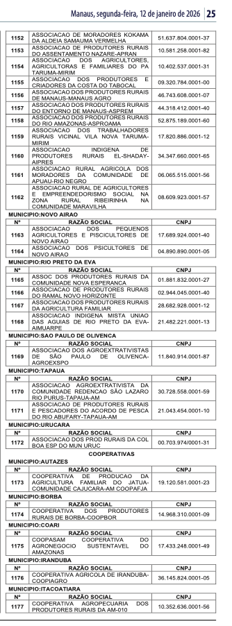 Além dos produtores rurais que vão ficar com o produto encalhado e sequer serão chamados pela ADS (como já ocorreu em anos anteriores), agora divulgo também a lista das ASSOCIAÇÕES e COOPERATIVAS — que reúnem centenas de famílias em cada grupo formal — que já foram e continuarão sendo enganadas pela ADS. A maioria não venderá nada. Algumas conseguirão apenas migalhas. E as “amigas” até venderão alguma coisa, mas ainda assim em volume muito inferior ao que será comprado das agroindústrias. Esse é o problema que não querem enfrentar. Nem MP, nem TCE, nem MPC. Recebo mensagens falando em MPF, PF, CGU e TCU, mas é importante deixar claro: o recurso é estadual, portanto esses três órgãos não têm competência sobre o PREME. E repito: isso não começou agora. Já acontecia antes de 2018, mas a situação piorou após 2018, no atual governo. No fim das contas, quem manda é a ALEAM no PREME, o executivo só obedece.