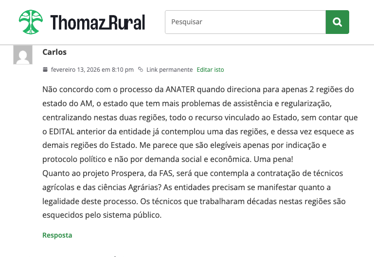 Divulgo abaixo um comentário que recebi no site do Portal Thomaz Rural sobre a postagem intitulada “Façam outro de otário, menos EU”. Os representantes do povo do Amazonas precisam dar um basta em quem recebe milhões e não entrega retorno a quem realmente precisa. É fundamental acompanhar de perto a elaboração desses editais do governo federal — muitos não conhecem a realidade da região e escutam apenas quem não se preocupa com a dignidade de quem preserva a floresta para o mundo. Analisem com atenção esse comentário, que não é isolado. O Portal tem esse espaço aberto no site — podem usar, além do Facebook e do Instagram.