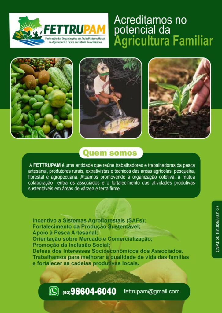 A FETTRUPAM nasce do compromisso com quem vive do trabalho na terra, nas águas e na floresta. Somos uma entidade que reúne trabalhadores e trabalhadoras da pesca artesanal, produtores rurais, extrativistas e técnicos das áreas agrícola, pesqueira, florestal e agropecuária, unidos pela defesa de um modelo de desenvolvimento justo, sustentável e inclusivo.