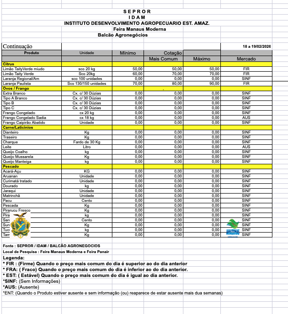 O Balcão de Agronegócios do SEBRAE/AM divulgou os preços praticados no ATACADO e VAREJO ne Manaus Moderna. O Balcão é parceria com a FAEA/SENAR/FUNDEPEC e IDAM. A coleta dos preços é feita pelo colaborador do IDAM, Valdemir Baia. Clique no link abaixo para abrir a planilha com os preços.