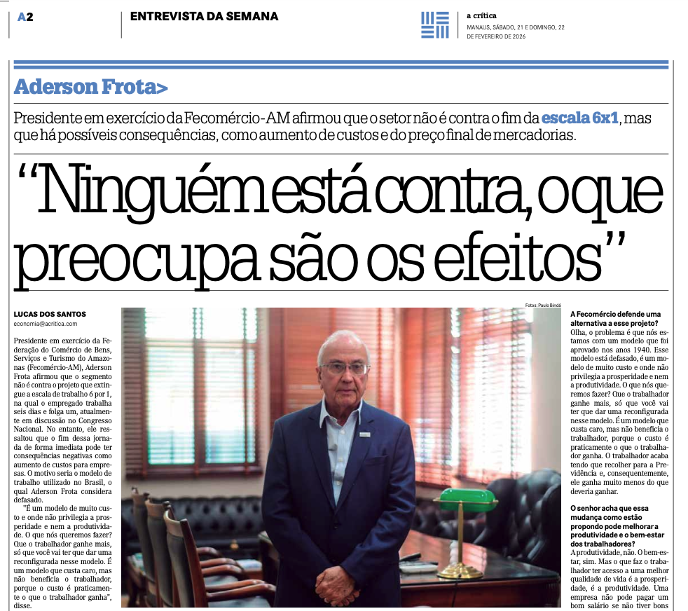 O debate sobre o fim da escala 6×1 tomou conta das redes e do Congresso, mas é preciso olhar para além do populismo e enxergar a realidade de quem produz. Em entrevista recente ao jornal A Crítica, o presidente da Fecomércio-AM, Aderson Frota, foi cirúrgico: “Ninguém está contra, o que preocupa são os efeitos”. Frota alerta que a redução imediata da jornada, sem uma reestruturação do modelo de custo do trabalho no Brasil, terá um efeito cascata. O setor agrícola repassa o custo para a indústria, que repassa para o comércio, e quem paga a conta final é a população de baixa renda no preço dos alimentos e serviços. Como ele bem pontuou, a produtividade no Brasil é baixa porque o modelo é defasado: o custo para a empresa é quase o dobro do que o trabalhador efetivamente recebe. Onde está o verdadeiro dinheiro? Concordo plenamente com a preocupação da Fecomércio, mas acrescento um ponto que o Congresso parece ignorar propositalmente: a conta não deveria cair sobre o empreendedor. Se o Brasil quer um país mais digno e feliz, por que o debate não começa pelo estancamento da sangria dos cofres públicos? Enquanto se discute aumentar o custo de quem gera emprego, assistimos passivamente a: