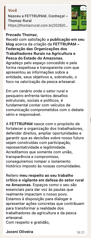 Já faz muito tempo que conheço o Joceni. Temos pontos convergentes e divergentes, mas sempre mantivemos um diálogo respeitoso. Reconheço nele um guerreiro, um lutador pela pesca em nosso estado. Como leitor do Portal Thomaz Rural, compartilho abaixo uma mensagem que recebi dele, publicada em um grupo de WhatsApp.