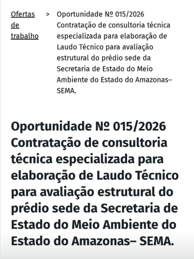Recebi a informação de que a ONG FAS está contratando uma consultoria para elaborar um laudo técnico sobre a estrutura do prédio sede da SEMA, na Avenida Mário Ypiranga. Se não estou equivocado, esse edifício já foi alvo de graves preocupações estruturais e interdições no passado. O que me intriga é: precisa mesmo ser uma ONG para bancar essa avaliação? Embora a sede envolva recursos do banco alemão KfW, acredito que teríamos outros órgãos e caminhos oficiais para realizar tal laudo. No Amazonas, de fato, acontece de tudo… Confira o link da contratação abaixo.” O espaço continua aberto. Sempre é bom lembrar que o atual titular da SEMA veio da ONG FAS. E o titular da ONG FAS já foi secretário de meio ambiente do Eduardo Braga.