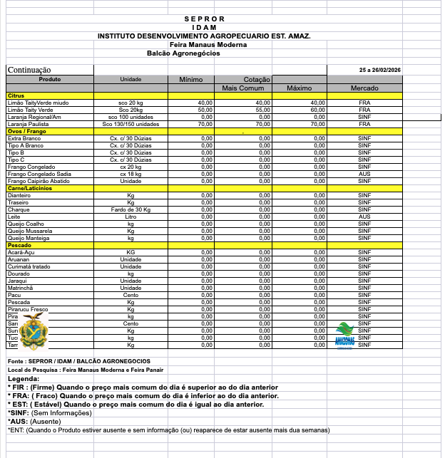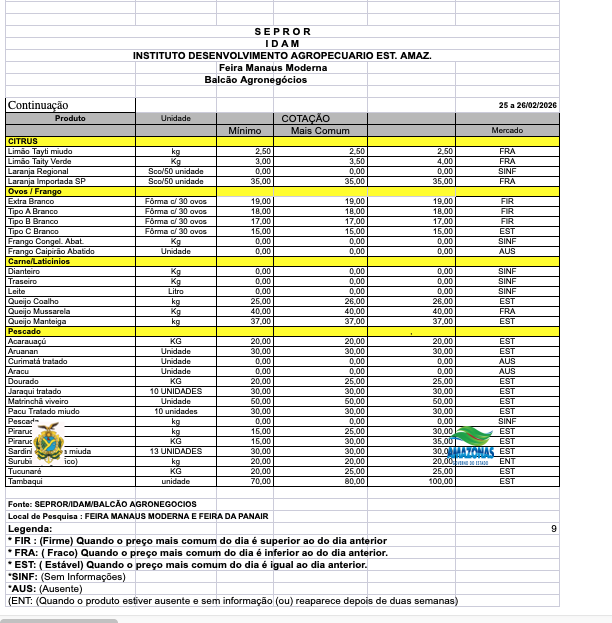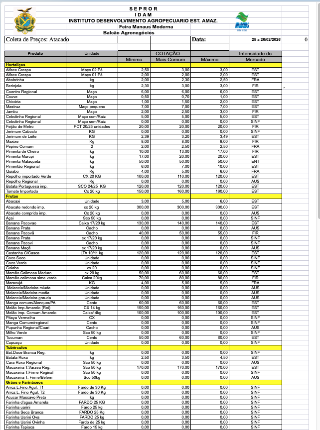 Veja, abaixo, a lista completa de preços no ATACADO e VAREJO praticados em Manaus. O levantamento é feito pelo colaborador Baia, do IDAM, que integra a equipe do Balcão de Agronegócios do SEBRAE, em parceeria com FAEA/SENAR/FUNDEPEC e IDAM.