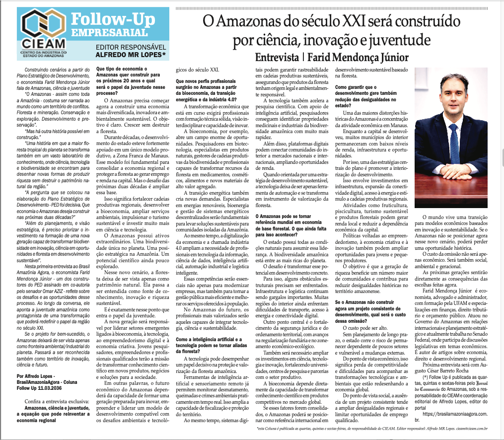 Li com atenção a entrevista do economista Farid Mendonça Júnior, publicada na coluna Follow-Up Empresarial do CIEAM (11.03.2026). Farid é um dos principais nomes da assessoria do senador Omar Aziz e também um dos responsáveis pelo recente Plano Estratégico de Desenvolvimento apresentado para o Amazonas. Sobre a entrevista, faço algumas considerações.