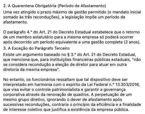 O Decreto Estadual n.º 39.032/2018, em seu Art. 21, § 2.º, determina que, para fins de contagem do prazo máximo de permanência, deve-se considerar a transferência de diretor para outra diretoria da mesma empresa estatal. Portanto, a mudança de “Diretoria de Crédito” para “Diretoria de Administração”, por exemplo, não zera o contador de tempo de gestão para quem já atingiu o limite de reconduções.