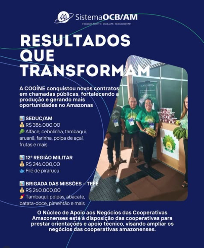 A COOINE conquistou novos contratos em chamadas públicas, fortalecendo a produção e gerando mais oportunidades no Amazonas. Pela SEDUC/AM, foram movimentados R$ 386.000,00, com o fornecimento de produtos como alface, cebolinha, tambaqui, aruanã, farinha, polpa de açaí, frutas, entre outros. Na 12ª Região Militar, o volume chegou a R$ 246.000,00, com destaque para o fornecimento de filé de pirarucu. Já na Brigada das Missões – Tefé, foram R$ 260.000,00 em contratos, incluindo tambaqui, polpas, abacate, batata-doce, pimentão e outros produtos. O Núcleo de Apoio aos Negócios das Cooperativas Amazonenses do Sistema OCB/AM está à disposição das cooperativas para prestar orientações e apoio técnico, com o objetivo de ampliar os negócios das cooperativas no estado.
