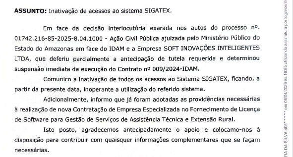 O IDAM oficializou a desativação imediata do sistema SIGATEX em todo o Amazonas. A medida cumpre decisão judicial em uma Ação Civil Pública que investiga o Contrato nº 009/2024, firmado com a empresa Soft Inovações Inteligentes.