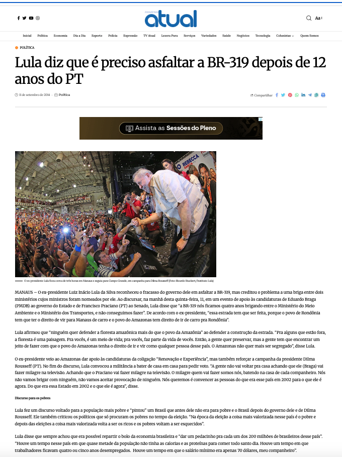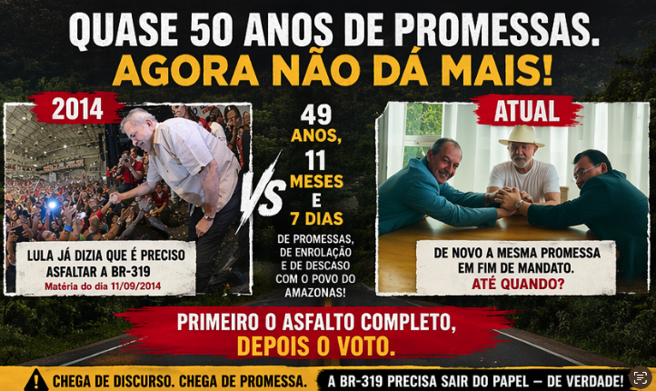 Para reforçar isso, basta olhar para trás: em 2014 depois de uma década de PT, o próprio presidente Lula ainda falava da necessidade de asfaltar a BR-319 — ou seja, essa promessa vem sendo repetida há mais de uma década, sem solução definitiva. Já estamos em 2026. Veja foto e matéria abaixo…