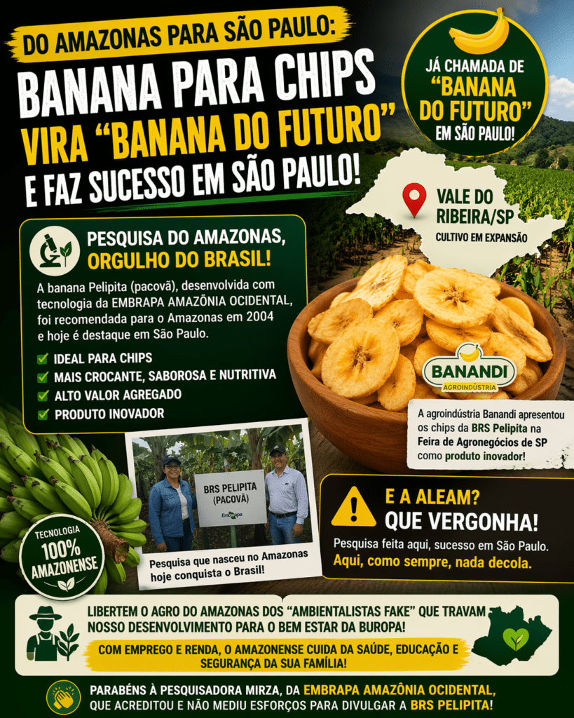 Conversei com a pesquisadora Mirza, da EMBRAPA Amazônia Ocidental, sobre a banana Pelipita (uma espécie de pacovã) desenvolvida com tecnologia amazonense. Ainda na época em que eu estava na CONAB, participei de um evento do agro em Manacapuru, onde a Mirza já apresentava essa variedade de banana, destacando seus inúmeros benefícios. Hoje, fico sabendo que, em São Paulo, ela já é chamada de “banana do futuro”, inclusive com cultivo no Vale do Ribeira. O vídeo que compartilho abaixo foi produzido pela Assembleia Legislativa de São Paulo. E a nossa ALEAM? Que vergonha. Uma pesquisa feita aqui ganhando destaque lá fora. No vídeo, fica evidente um ponto importante: falta produção. A empresa possui vários pontos de venda de banana chips, mas ainda utiliza a variedade nanica. No entanto, a Pelipita é muito superior. Como sempre tenho dito, o agro do Amazonas, quando se livrar de quem trava o desenvolvimento — os “ambientalistas fake” que atuam mais em favor da Europa do que do nosso povo —, terá plenas condições de gerar emprego e dar dignidade ao amazonense. Com renda no bolso, o cidadão cuida melhor da saúde, da educação e da segurança da sua família.