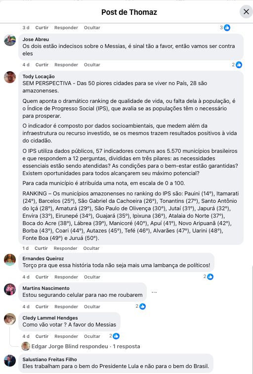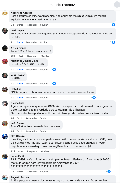 Que bom ver o povo amazonense despertando para o papel das ONGs e dos políticos. Já passou da hora de parar de nos usar — e de usar o discurso da floresta em pé (que continuará existindo) apenas para captar recursos, sem promover mudanças reais na vida dos mais de 4 milhões de pessoas que vivem aqui.