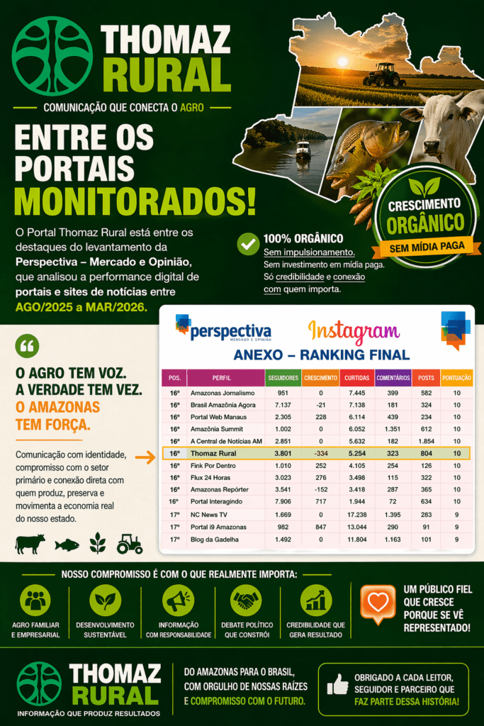 O Portal Thomaz Rural passa a figurar em levantamento da Perspectiva – Mercado e Opinião, que analisou a performance digital de portais e sites de notícias entre agosto de 2025 e março de 2026. Mais do que um dado numérico, essa presença confirma algo construído com consistência: um canal de comunicação com identidade própria, compromisso com o setor primário e conexão direta com quem produz, preserva e movimenta a economia real do Amazonas. Estamos cientes de que um setor agropecuário forte movimenta o comércio, serviços e a agroindústria. Criado inicialmente para dar visibilidade às ações da CONAB, o Thomaz Rural evoluiu e se consolidou como uma plataforma com foco principal ao agro familiar e empresarial, sem abrir mão de um ponto essencial: o debate político. Porque não existe desenvolvimento do agro sem decisão política, sem orçamento, sem prioridade. O crescimento do portal chama atenção por um fator determinante — é 100% orgânico. Não houve impulsionamento, não houve investimento em mídia paga. O alcance vem da credibilidade, da linguagem direta e da identificação com um público fiel, que cresce porque se vê representado. Esse público tem lado: defende a produção sustentável, valoriza quem trabalha no interior, respeita a floresta em pé, mas não aceita narrativas que travam o desenvolvimento econômico da região. A presença no ranking não é ponto de chegada. É sinal claro de que existe espaço — e demanda — por uma comunicação que fale a verdade sobre o agro amazônico. Entre INSTAGRAM e SITE temos, aproximadamente, 50 mil visualizações por mês. Grato a todos que apoiam este canal de comunicação.
