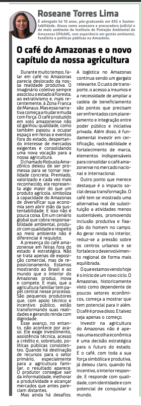 Não conheço pessoalmente a Roseane, mas o artigo publicado hoje no Em Tempo merece destaque. É exatamente essa visão que precisamos fortalecer sobre o Amazonas: moderna, estratégica e conectada com as oportunidades reais do nosso setor produtivo. Advogada, com passagem pelo IPAAM e pós-graduada em ESG e Sustentabilidade, Roseane traz uma reflexão consistente e necessária sobre o papel do café e do setor primário no desenvolvimento do Estado. O Portal Thomaz Rural segue aberto a contribuições que somem nesse mesmo caminho: ideias, análises e propostas que ajudem a impulsionar o nosso Amazonas com responsabilidade, inovação e geração de renda no interior. Só acrescentaria o indispensável ZEE do Amazonas.