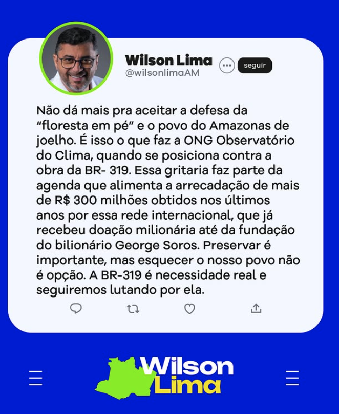 Seguindo uma linha que considero equivocada, o ex-governador Wilson Lima divulga NOTA e omite quem fez parte de seu governo e é aliado dessa ONG que entrou na justiça contra a BR-319. O seu titular da SEMA por 7 anos veio da ONG FAS que, sabidamente, é contra o asfaltamento da BR-319. É importante destacar que entidades como a Fundação Amazônia Sustentável (FAS) e o Instituto de Conservação e Desenvolvimento Sustentável da Amazônia – IDESAM possuem participação em redes mais amplas, como a ONG “Observatório do Clima”, que atuam diretamente na agenda ambiental nacional e internacional. Ignorar essa conexão é jogar contra o povo do Amazonas. A permanência, por sete anos, de ongueiros ligados a essas organizações dentro da Secretaria de Estado do Meio Ambiente do Amazonas, como aconteceu no governo do Wilson Lima, levanta questionamentos legítimos sobre conflito de interesses e sobre quem, de fato, orienta a política ambiental estadual.