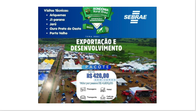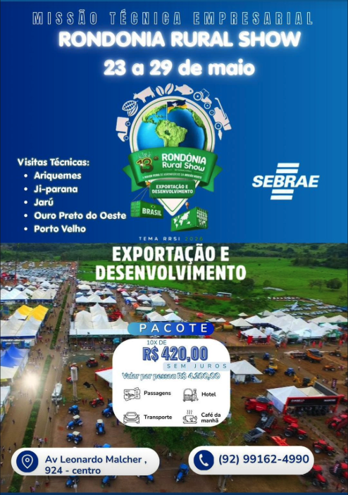 A Missão Técnica Empresarial para a Rondônia Rural Show 2026 reúne produtores, empreendedores e lideranças em uma das maiores vitrines do agronegócio da região Norte. Serão dias de imersão, troca de experiências e acesso a tecnologias, inovação e oportunidades reais de crescimento. Com visitas técnicas em municípios estratégicos e uma programação voltada para exportação e desenvolvimento, essa missão é ideal para quem quer ampliar conhecimento, fortalecer conexões e enxergar novos caminhos para o campo. Garanta sua participação e faça parte desse movimento que valoriza quem produz e impulsiona a economia regional.