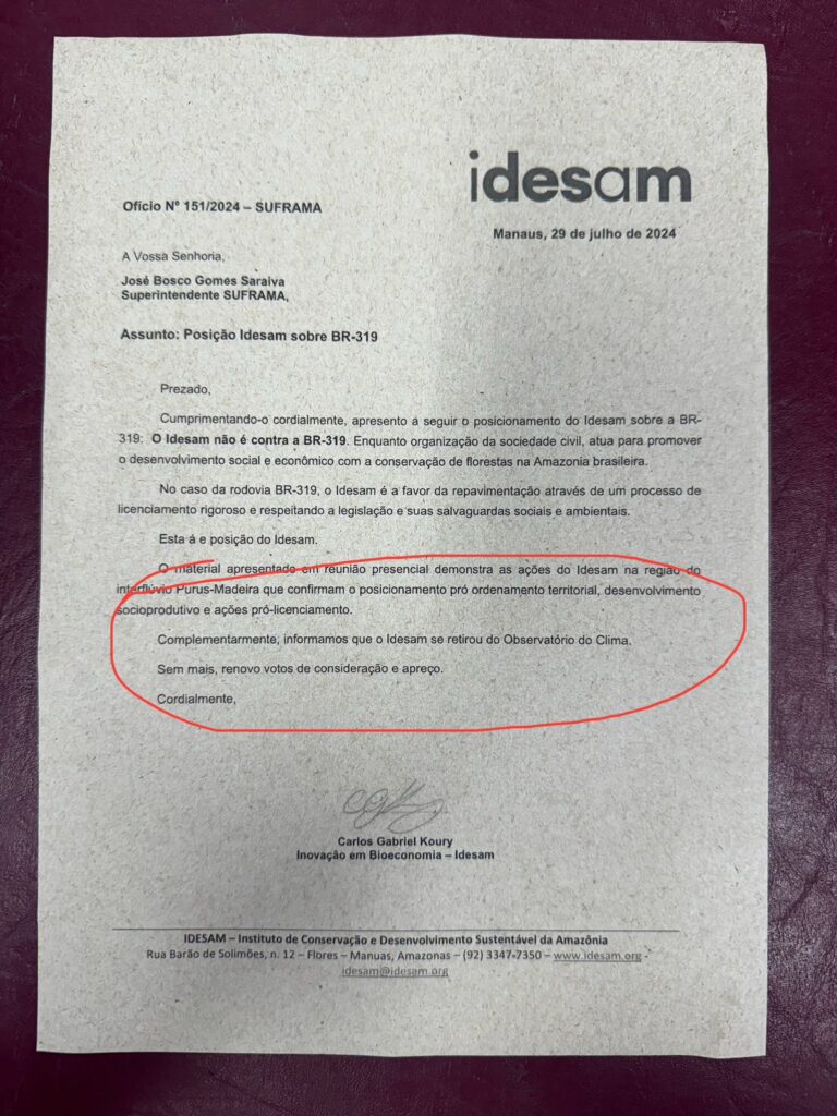 A gota d’água ocorreu em meados de 2024. No dia 29 de julho de 2024, o IDESAM emitiu o Ofício nº 151/2024 – SUFRAMA, assinado por Carlos Gabriel Koury (Diretor de Inovação em Bioeconomia). O documento (anexo 2), endereçado ao Superintendente da SUFRAMA, José Bosco Gomes Saraiva, é taxativo ao declarar: